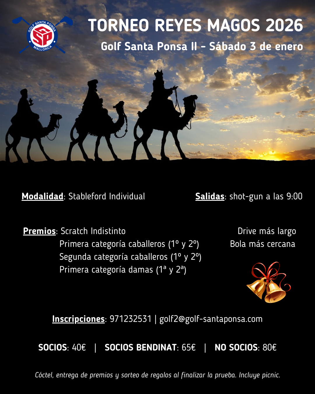 Home Events - Golf Santa Ponsa Torneo Reyes Magos 2026 Torneo Reyes Magos 2026 + Add to Google Calendar + iCal / Outlook export 00 days 00 hours 00 minutes 00 seconds Date Jan 03 2026 Time All Day Share this event